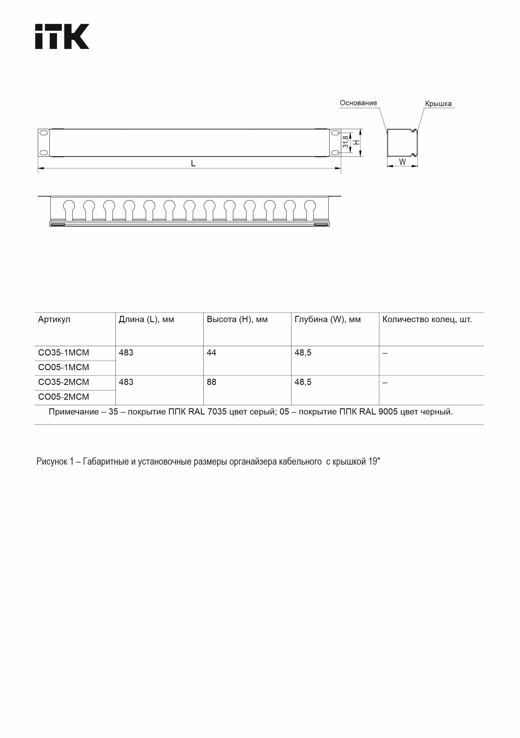 ITK Кабельный органайзер с крышкой 19" 1U серый