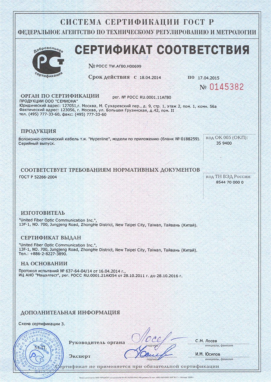 | Вид продукции | кабель волоконно-оптический (внутренний) |