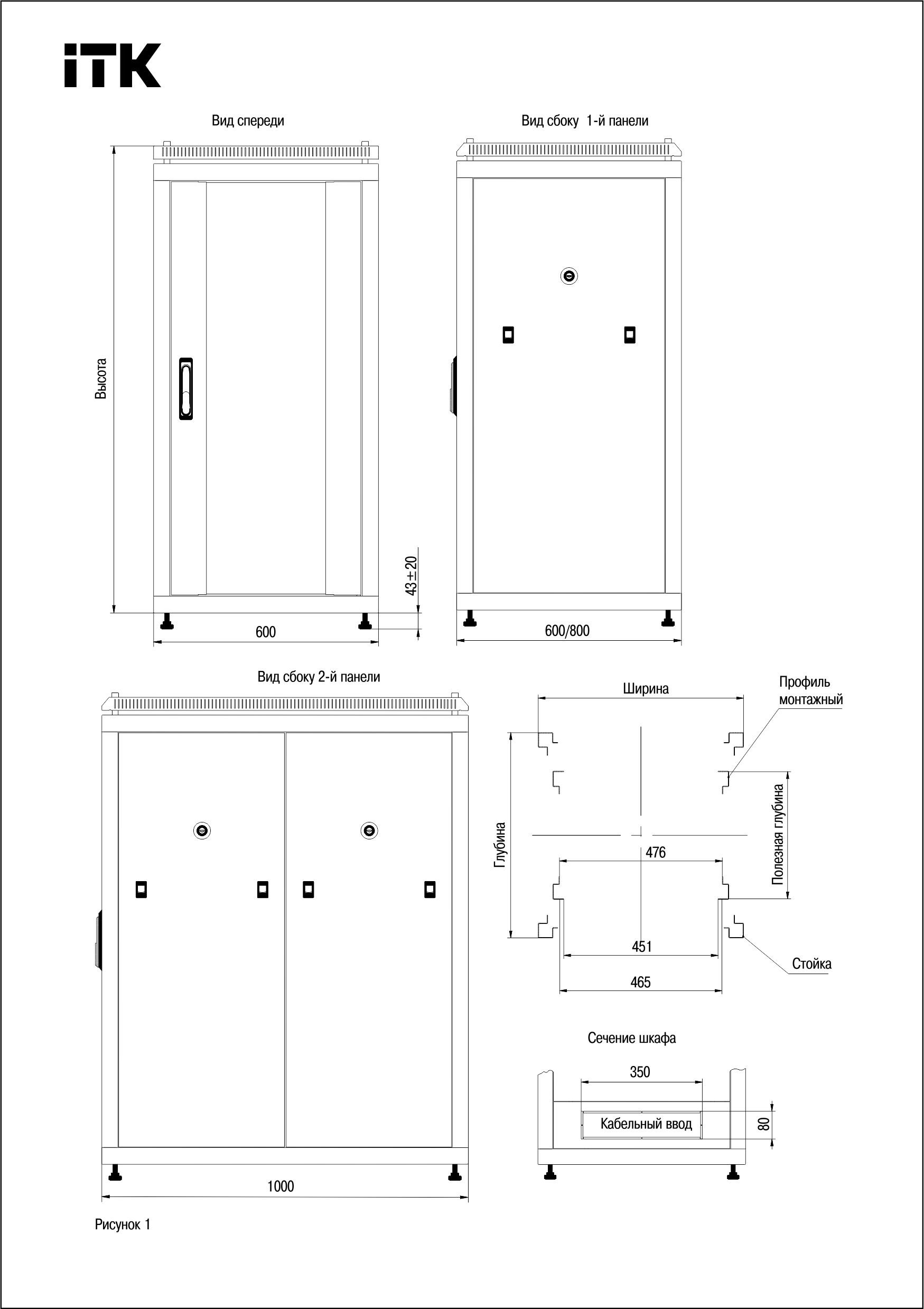В комплект поставки шкафа включены 19" G-образные монтажные профили (4 шт.), регулируемые опоры (ножки) позволяющих компенсировать неровности пола. Возможна установка поворотных роликов (в комплект поставки не входят) одновременно с опорами. Комплект заземления шкафа позволяет соединить все части шкафа в единый контур заземления. Шкафы могут быть состыкованы между собой с помощью комплекта для соединения.