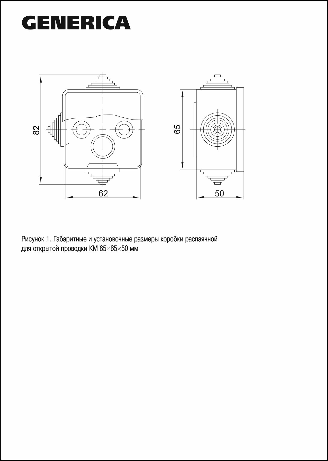 Коробка распаячная КМ для открытой проводки с откидной крышкой 65х65х50мм IP54 4 гермоввода (7035) GENERICA
