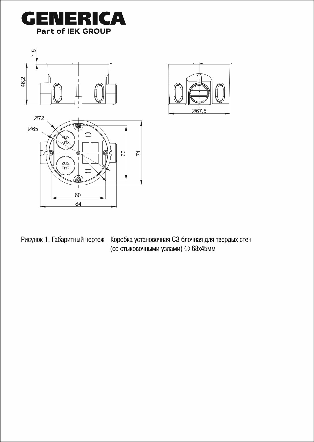 Установочная коробка (подрозетник) глубиной 45мм со стыковочными узлами предназначена для установки в сплошных стенах (кирпич, бетон и т.д.) и коммутации шлейфом электроустановочных изделий (розетки, выключатели и т.д.).