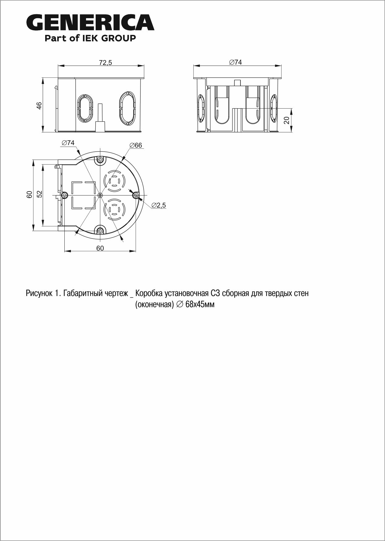 Коробка установочная СЗ сборная для твердых стен D=68х45мм (оконечная) GENERICA
