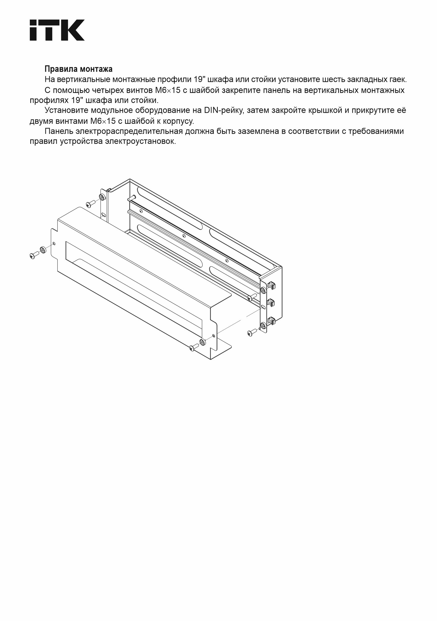 Панель состоит из корпуса, лицевой съемной крышки и DIN-рейки. На обратной стороне предусмотрены окна для ввода кабелей в панель. Электрораспределительная панель устанавливается на вертикальные монтажные профили с помощью крепежа винт-шайба-гайка. На корпусе предусмотрена возможность организации заземления изделия.