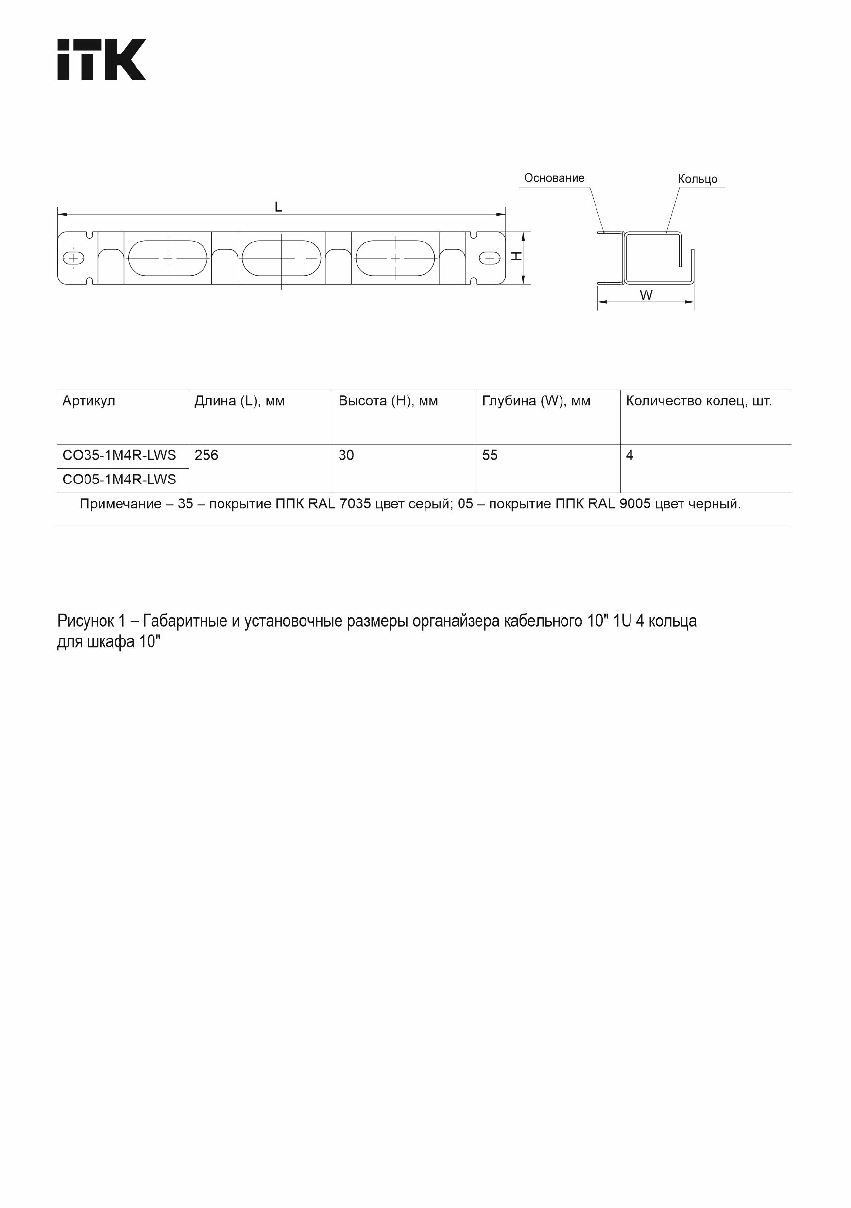 ITK Кабельный органайзер 10" 1U 4 кольца для шкафа 10" серии LINEA WS черный